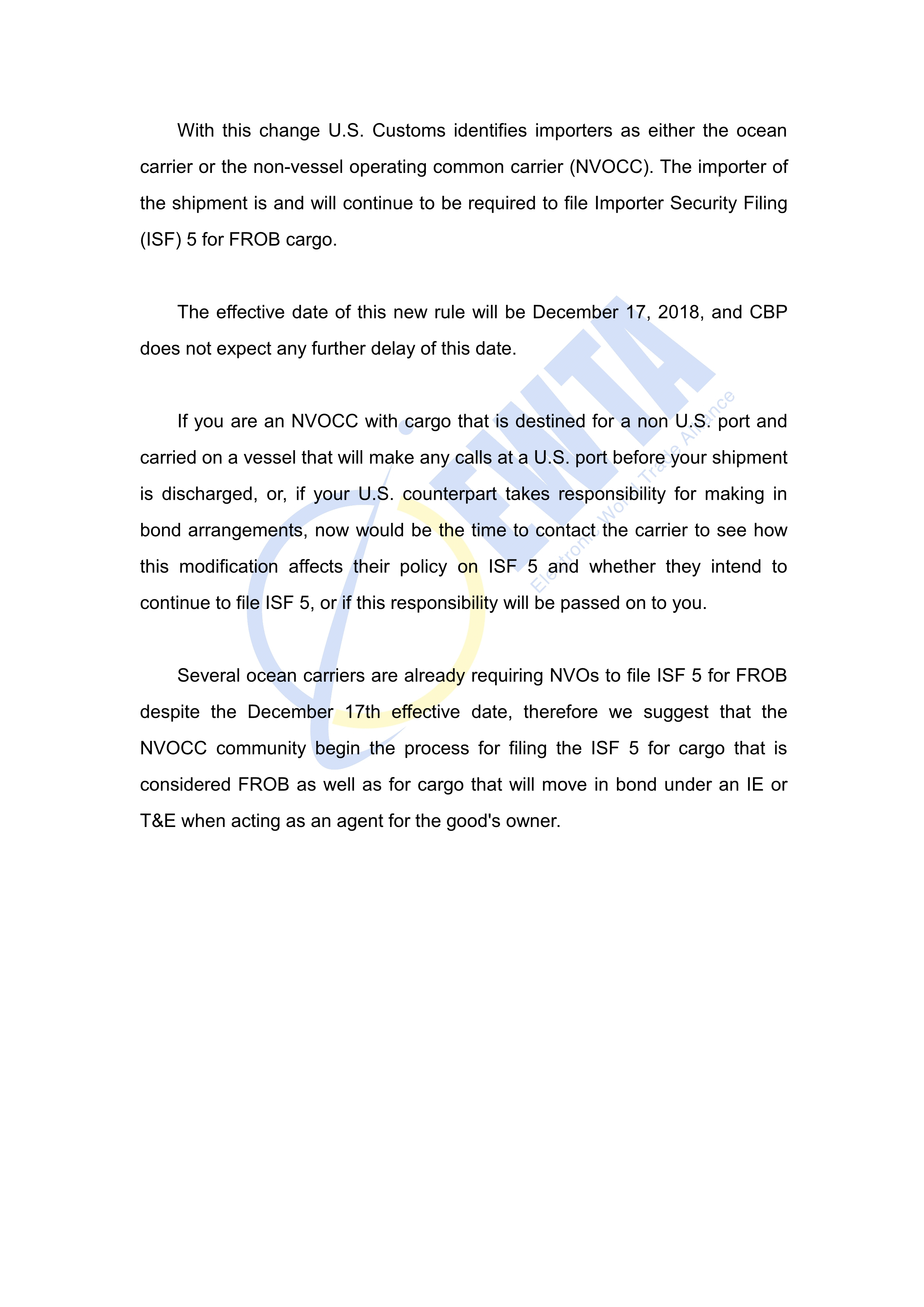 如果你是一個NVOCC(Non-Vessel Operating Common Carrier,即無船公共承運人),貨物運輸目的地不是美國港口,但貨物卸貨之前船舶會掛靠美國境內(nèi)港口,或者如果您的美國對應方負責進行進口安排,這個時候你需要聯(lián)系相關(guān)船公司,看看這次政策的修改船公司是否對ISF5申報有所改變,有可能船東把申報的責任轉(zhuǎn)移給NVOCC!