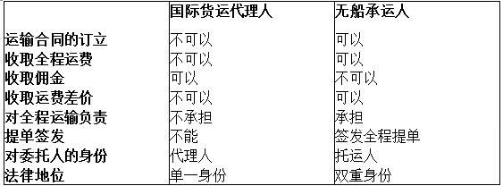 貨運(yùn)代理人與無船承運(yùn)人的區(qū)別可見下表: